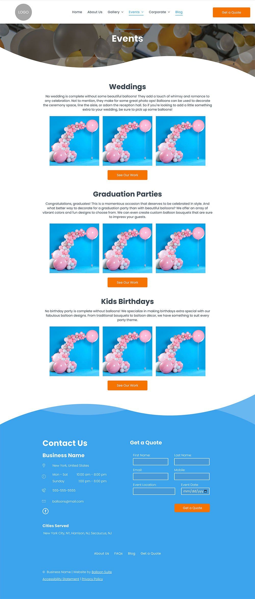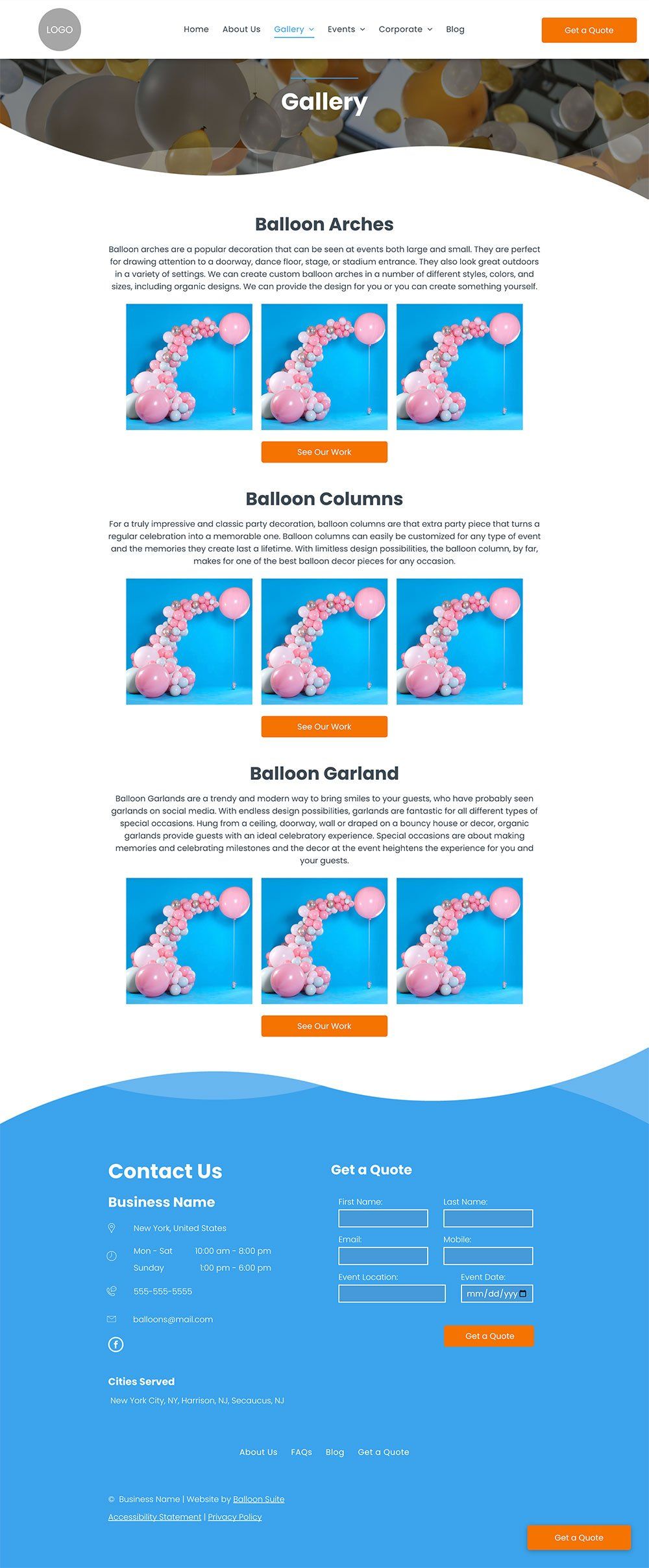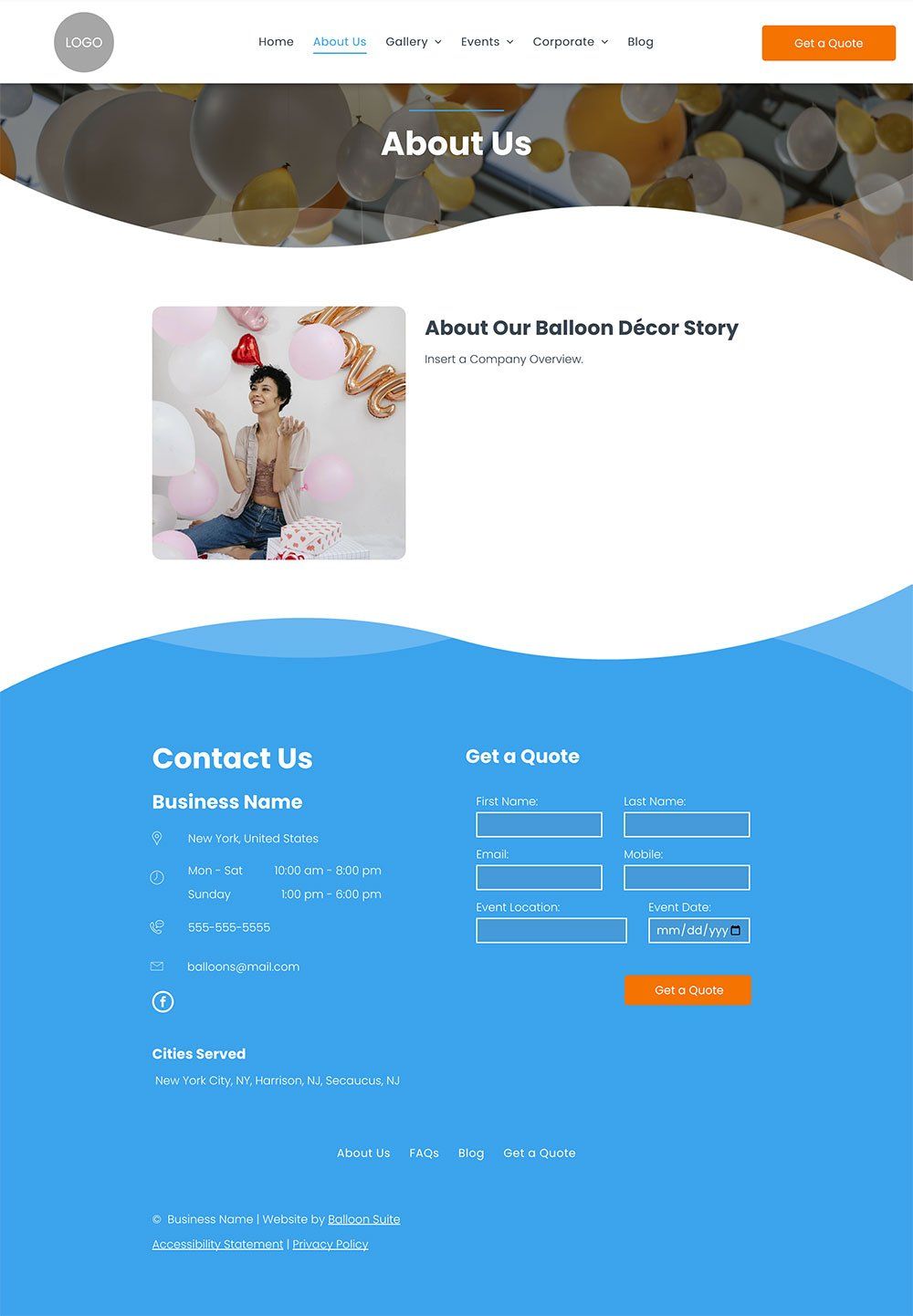 No balloon business website is complete without an "About Us" page. The truth is that consumers today want to know who is behind the company and where it started. Reading your company bio gives the person a feel for who you are and what the company stands for. Though you don't have to go into great detail, this is an excellent place to begin connecting with prospects. This is especially true for the balloon decorating industry because you may often have to complete setup at a client's event.