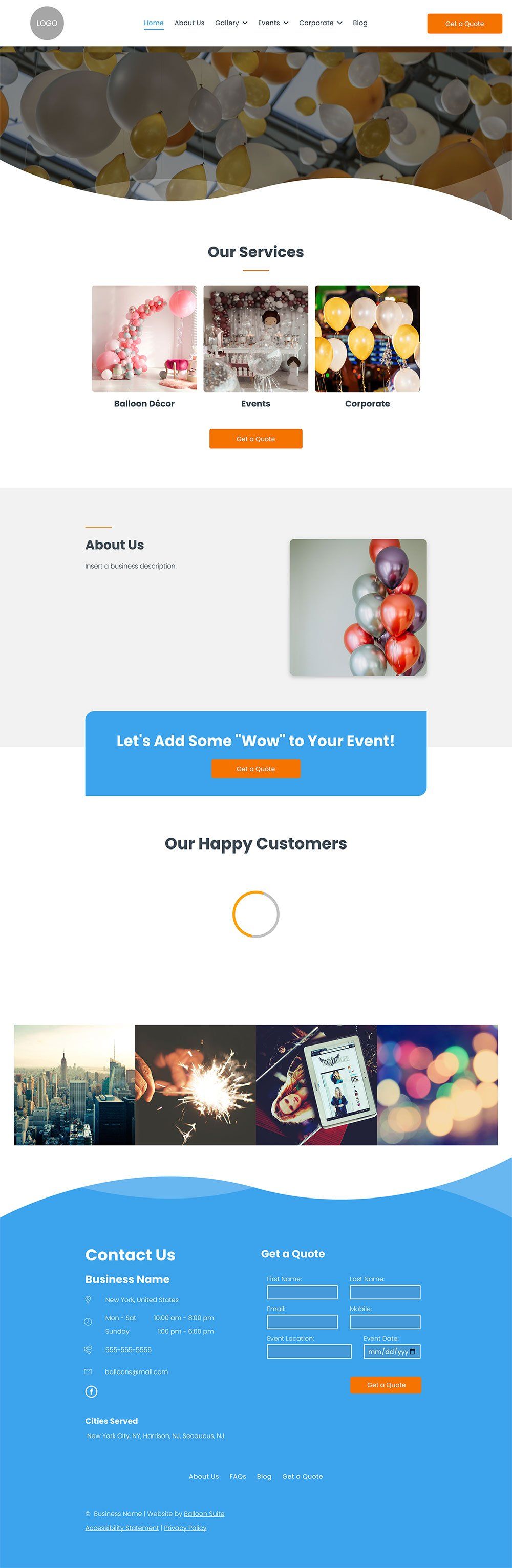 One of the most important first steps is establishing a goal for your balloon business website and then turning it into a call-to-action. In the case of the Wave template, we've already installed a "Get A Quote" button front and center. This works well to draw your client's attention right where it should be and encourages them to take the action you want.